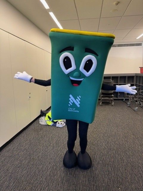 The costume is constructed from light-weight foam and is open at the base for access and ventilation.